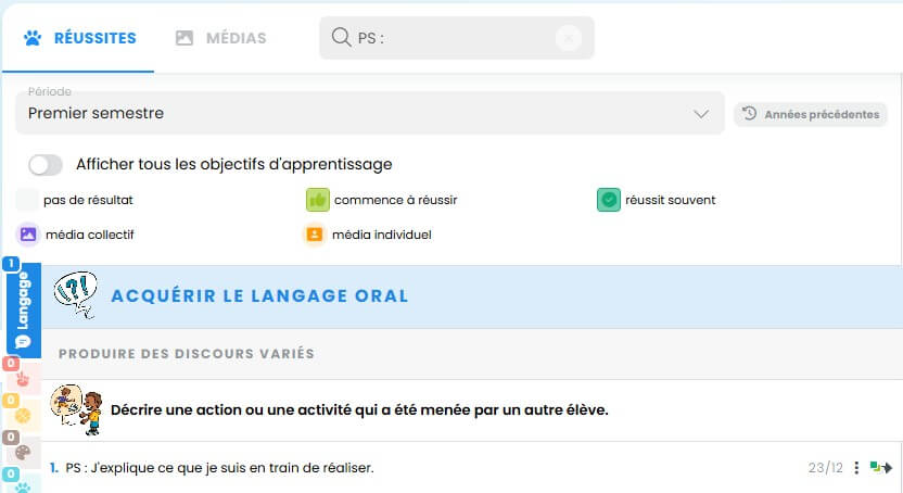 Nos réussites ne sont jamais liées à un niveau de cycle 1 en particulier, car les enfants peuvent valider une compétence à des âges différents. Mais pour une question d'organisation, il peut être pratique d'avoir un repère de niveau sur les réussites. Il est possible de créer une réussite (ou de modifier une proposition de réussite) en précisant son niveau au début de la ligne. Vous pourrez alors utiliser la rubrique de filtre et taper le niveau de votre choix pour ne voir apparaître que les réussites liées.