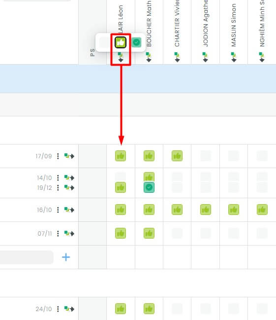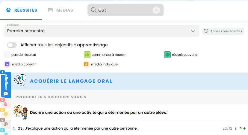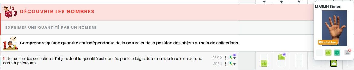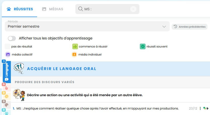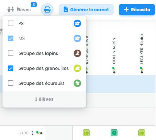 Vous avez une classe multi-niveaux (par exemple PS-MS-GS), mais seuls vos MS ont été évalués sur une compétence et ils ont tous réussi ? Le filtre Élèves peut être pratique pour n'afficher que les MS et faire une saisie globale, sans compléter en même temps les résultats des autres niveaux.