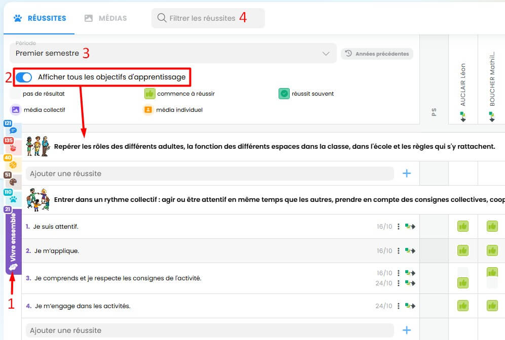 - Choisissez d'afficher tous les objectifs d'apprentissage (2), ou uniquement ceux pour lesquels vous avez renseigné des réussites.