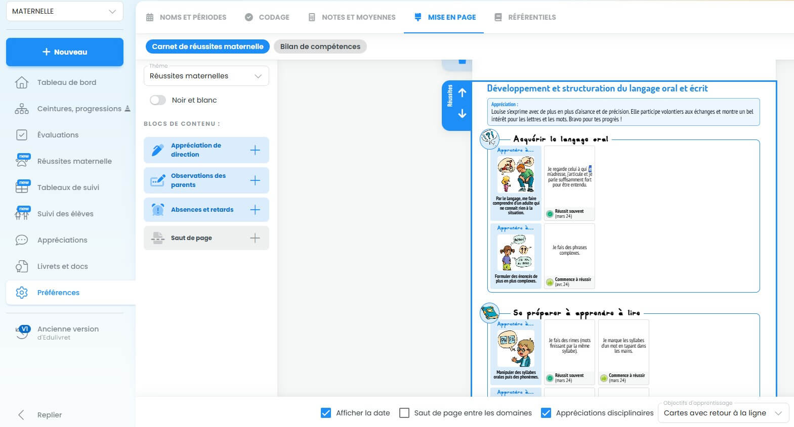 - Le menu "Préférences" d'Edulivret vous offre un large choix de personnalisation : prenez le temps d'explorer les différents onglets en haut de la page. Les options de mise en page se choisissent directement en cliquant sur les blocs à modifier dans le modèle de livret "Louise Dupont".