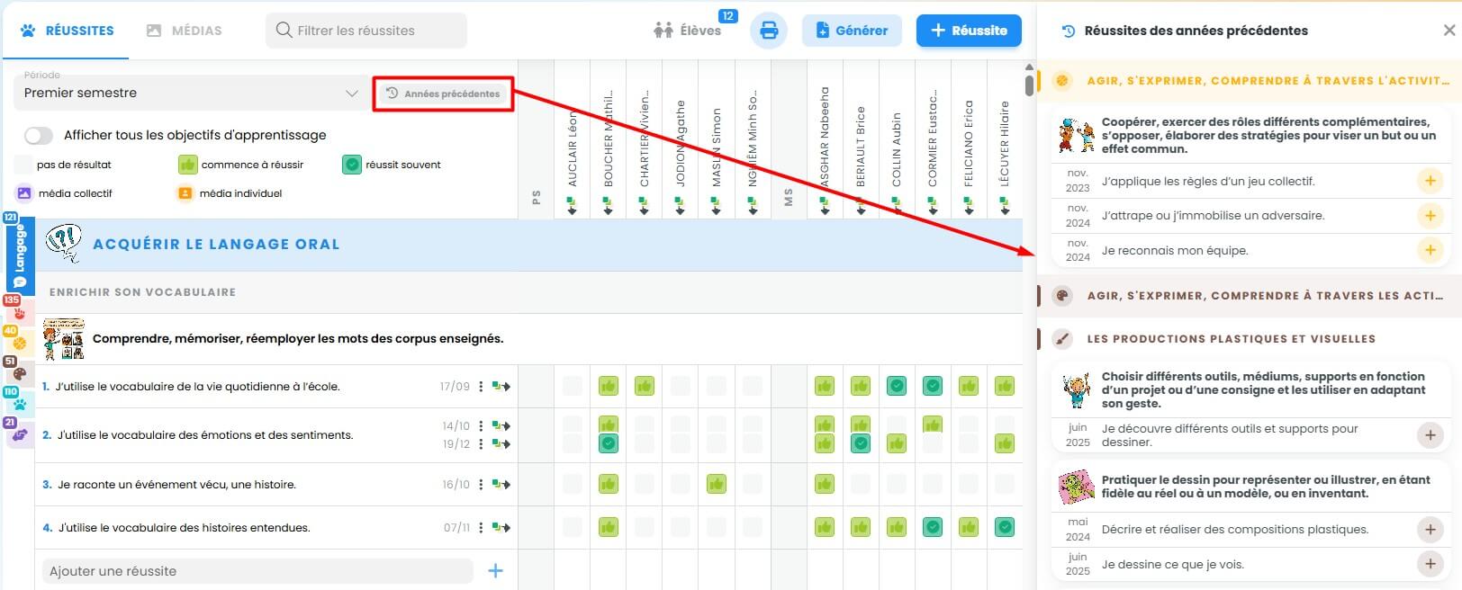 - Ne faites pas table rase chaque année ! Les réussites que vous avez créées les années passées peuvent être réutilisées durant l'année en cours : cliquez sur le bouton gris "Années précédentes" pour les retrouver et les intégrer en quelques clics dans le tableau.