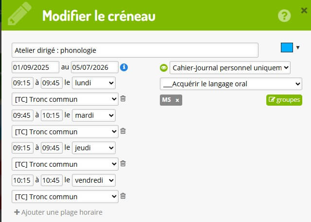 Vous fonctionnez en ateliers, par exemple vous faites tourner un atelier de phonologie sur quatre groupes toute la semaine ? Vous n'aurez pas besoin de créer tous vos créneaux un par un dans l'emploi du temps. Edujournal vous permet de créer plusieurs créneaux pour un domaine identique, comme dans l'exemple ci-dessous :
