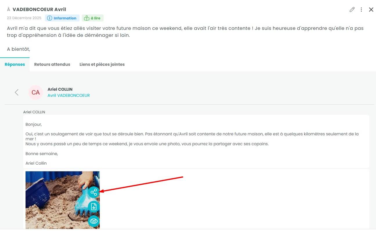 Pour tout média envoyé par un parent, vous avez un menu à 3 points et une icône de partage. Cliquez sur celle-ci : vous pourrez alors choisir d'intégrer l'image à une publication du cahier de vie existante, ou dans un nouvel article.